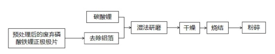 摘要:本發(fā)明涉及鋰離子電池正極材料制備領(lǐng)域,公開(kāi)了一種磷酸鐵鋰正極材料及其制備方法。該方法包括以下步驟:(1)將預(yù)處理后的廢棄磷酸鐵鋰正極極片置于水中攪拌,去除鋁箔,然后加入碳酸鋰,混勻后進(jìn)行濕法研磨,然后進(jìn)行干燥,得到干粉;(2)將步驟(1)得到的干粉在惰性氣氛下進(jìn)行燒結(jié),然后粉碎;其中,以所述預(yù)處理后的廢棄磷酸鐵鋰正極極片的總重量為100%計(jì),所述碳酸鋰的用量為8.5-12.5重量%。該方法將廢棄的磷酸鐵鋰極片進(jìn)行回收處理制備磷酸鐵鋰正極材料,工序簡(jiǎn)單、能源消耗少、生產(chǎn)成本低、節(jié)能環(huán)保。