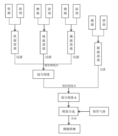 摘要:本發(fā)明提供一種鋰離子電池磷酸鐵鋰正極材料的制備方法,具體按以下步驟制備:1)將可溶性鐵源、鋰源、磷源、碳源分別溶解于溶劑,并對(duì)溶液進(jìn)行精密過(guò)濾,分別得到鐵源溶液、鋰源溶液、磷源溶液和碳源溶液;2)將步驟1)得到的溶液按Li+:Fe3+:PO43-之間的摩爾比為1~1.05:0.95~1:1的比例混合并添加一定的碳源溶液,碳源和LiFePO4之間的摩爾比為0.5~4:1,使最終磷酸鐵鋰產(chǎn)品中的碳含量控制在1%~10%的范圍,得到混合溶液A;3)將混合溶液A在一定溫度條件和惰性氣體氣氛下噴霧合成,得到碳包覆的磷酸鐵鋰正極材料。本發(fā)明的制備方法簡(jiǎn)單,生產(chǎn)過(guò)程連續(xù)可控,原料在惰性氣氛下生成的磷酸鐵鋰材料純度高,結(jié)晶度好,形貌均勻,電化學(xué)性能優(yōu)異。