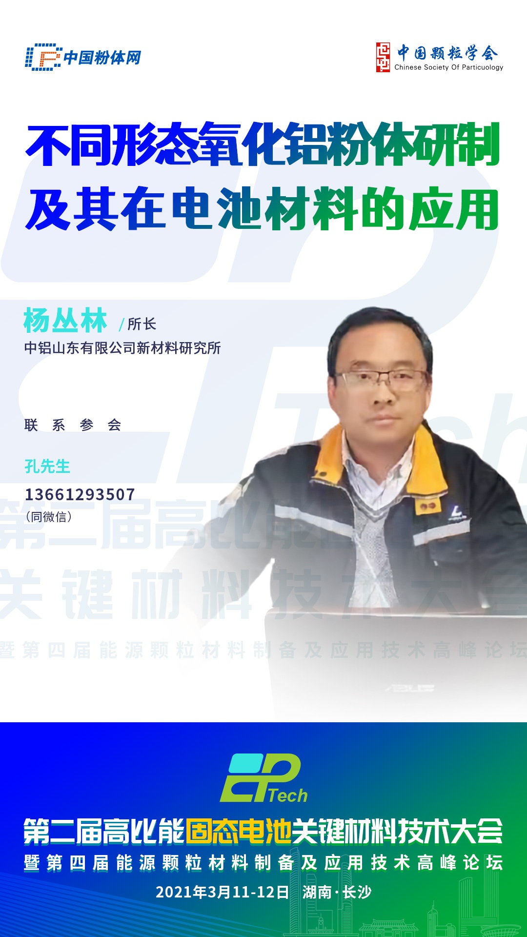 國內(nèi)中鋁山東有限公司致力于尖端鋁基粉體材料的應用技術(shù)研發(fā),解決高性能氧化鋁粉體及其延鏈產(chǎn)品的進口替代問題。2021年3月11-12日,由中國粉體網(wǎng)、中國顆粒學會能源顆粒材料專委會主辦,長沙礦冶研究院先進材料研究所協(xié)辦的“第二屆高比能固態(tài)電池關鍵材料技術(shù)大會”將在長沙吉美國際會展酒店隆重舉行,屆時,中鋁山東有限公司新材料研究所所長楊叢林將帶來報告《不同形態(tài)氧化鋁粉體研制及其在電池材料的應用》,介紹各種晶型、形貌的氧化鋁粉體的制備技術(shù),助力固態(tài)電池的發(fā)展。