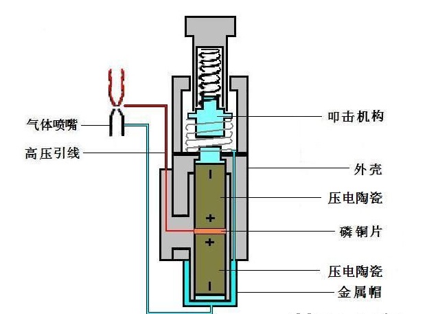 下圖是打火機(jī)的點(diǎn)火裝置實(shí)物圖和結(jié)構(gòu)示意圖,我們看到它里面用到了兩粒柱狀壓電陶瓷。當(dāng)我們按壓打火按鈕時(shí),彈簧會(huì)推動(dòng)一個(gè)重錘打擊壓電陶瓷柱,產(chǎn)生一數(shù)千伏的高壓火花,點(diǎn)燃可燃?xì)怏w。