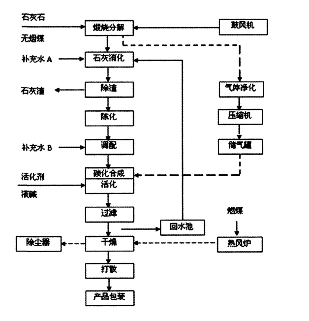 生產(chǎn)工藝分為原料準備工段,煅燒、洗氣工段,消化、制漿工段,碳化、活化工段,脫水、干燥、包裝工段五個工段。