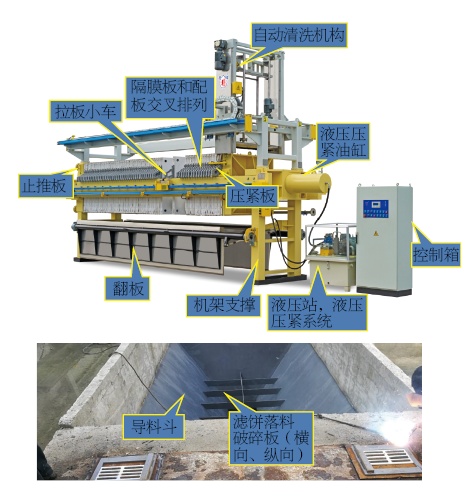 隔膜式壓濾機(jī)通過(guò)進(jìn)料泵輸送,將調(diào)理好的漿料以高壓輸入至設(shè)備的濾室內(nèi),漿料通過(guò)模板和隔板之中濾布,濾液滲析出濾布,而固體截留于濾布上。