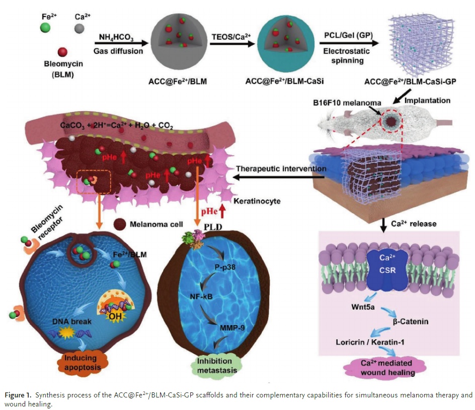 【文章亮點(diǎn)】:作者通過(guò)將具有臨床藥物博萊霉素(BLM)、結(jié)合其活性激發(fā)因子Fe2+離子,一起通過(guò)氣相擴(kuò)散的方法,封裝在ACC中,既賦予了藥物緩釋的能力,又保證了Fe2+離子不被提前氧化。更近一步,結(jié)合ACC活潑的表面性質(zhì),將其沉積在電紡絲明膠/聚己內(nèi)酯(GP)納米纖維上,構(gòu)筑出一種可生物吸收的復(fù)合支架。在應(yīng)用到黑色素瘤切除后的傷口處時(shí),ACC可以調(diào)節(jié)傷口處的pH,降低其酸性,以此來(lái)提高藥物的抗腫瘤活性。并且,ACC這種鈣基材料還可以刺激傷口加速愈合。這種結(jié)合納米碳酸鈣載體和支架構(gòu)筑的腫瘤術(shù)后治療新材料,為敷料材料領(lǐng)域的發(fā)展提供了新的思路。