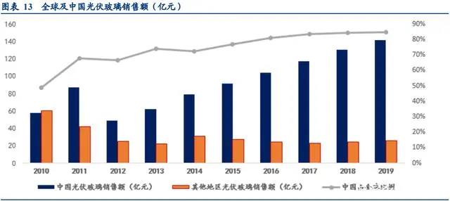 2011 年之后政策刺激帶動(dòng)需求爆發(fā),國內(nèi)企業(yè)開始海外建廠。2011 年和 2012 年, 美國和歐盟分別對(duì)中國光伏行業(yè)展開“雙反”調(diào)查,國內(nèi)光伏產(chǎn)業(yè)發(fā)展遭遇“貿(mào)易 戰(zhàn)”的阻礙。為應(yīng)對(duì)美歐“雙反”調(diào)查的不利影響,2012 年下半年政府出臺(tái)六項(xiàng)鼓 勵(lì)性政策,刺激光伏產(chǎn)業(yè)鏈發(fā)展。政策刺激下光伏玻璃需求增長(zhǎng)較大,2012-2013 年 國內(nèi)光伏玻璃銷售額均實(shí)現(xiàn) 25%以上的增長(zhǎng)。至 2016 年時(shí),中國光伏玻璃規(guī)模已占 全球份額 80%以上,國內(nèi)企業(yè)也開始在海外布局產(chǎn)能,信義在馬來西亞投產(chǎn) 900t/d 光伏玻璃產(chǎn)線,福萊特也在越南擴(kuò)張產(chǎn)能。2006 年到 2016 年的十年時(shí)間,中國光 伏玻璃行業(yè)實(shí)現(xiàn)從依賴進(jìn)口到國產(chǎn)替代再到替代進(jìn)口的轉(zhuǎn)變。目前我國是全球最大 光伏玻璃產(chǎn)國,2019 年光伏玻璃銷售額 141.11 億元,全球占比 85%;光伏玻璃產(chǎn)量 4.66 億平米,全球占比 86%。