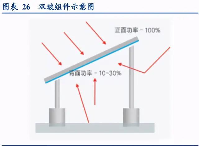 單玻組件為晶硅組件的主流產(chǎn)品,雙玻組件憑借發(fā)電增益優(yōu)勢(shì),滲透率有望提升。晶硅 光伏組件根據(jù)背面材質(zhì)可以分為雙玻組件和單玻組件,單玻組件的背板材料大部分為不 透光的復(fù)合材料(TPT、TPE 等),目前單玻組件仍是主流,2020 年單玻組件市占率 70% 左右,雙玻組件占比 29.7%;雙玻組件采用玻璃替代了單玻組件的復(fù)材背板,雙面采用 玻璃封裝。相比單玻組件,雙玻組件的生命周期更長(zhǎng),耐候性和耐腐蝕性更強(qiáng),衰減低于普通組件;發(fā)電效率更高,正面背面均有發(fā)電能力,背面可接受周圍環(huán)境的反射光、 散射光轉(zhuǎn)換為電能,根據(jù)不同地面環(huán)境雙面組件能夠提高 10%-30%的發(fā)電量。根據(jù)李亞 彬《360W 超高功率 n 型雙玻雙面發(fā)電組件研究及應(yīng)用》,采用背面無橫梁安裝方式時(shí),雙玻組件的發(fā)電量增益最高可以達(dá)到 32.99%,平均發(fā)電量增益約 21.38%;橫梁式安裝 方式,發(fā)電量增益最高可達(dá) 30.18%,平均發(fā)電量增益 20.10%。憑借發(fā)電量?jī)?yōu)勢(shì),雙玻 組件未來滲透率有望提升。