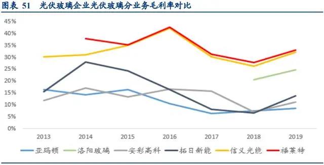 大窯爐內(nèi)部溫度更穩(wěn)定,成品率相比小型窯爐更高,可以實(shí)現(xiàn)單噸材料和燃料消耗下降、 生產(chǎn)效率的提升,1000t/d 生產(chǎn)線單位成本相較 300-600t/d 級(jí)的窯爐低 10%-20%。信義 光能和福萊特毛利率水平遠(yuǎn)高于行業(yè)其它公司,近年基本穩(wěn)定在 30%左右,二三梯隊(duì)的 光伏玻璃企業(yè)毛利率僅維持在 10%左右。從福萊特光伏玻璃業(yè)務(wù)的單位成本來看,整體 處于下降趨勢(shì),從 2015 年接近 20 元/平方米下降至 2019 年的 16 元/平方米左右。