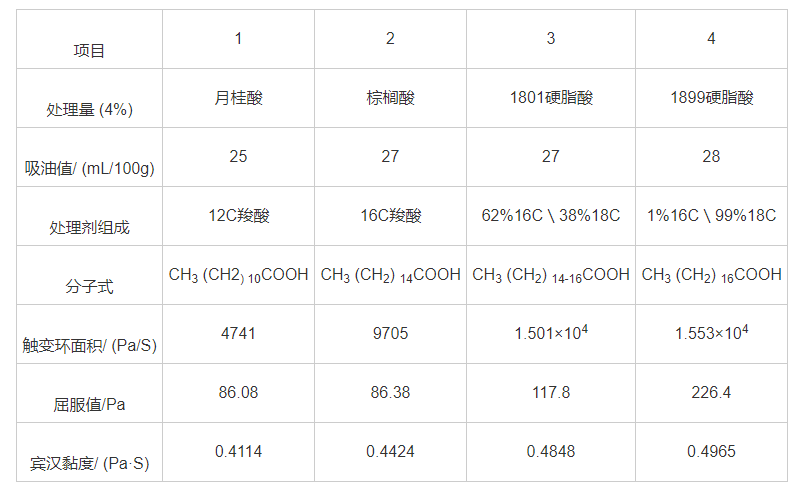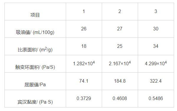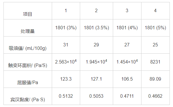 分析數(shù)據(jù)得知,加3%、3.5%、4%、5%的硬脂酸處理時(shí),觸變環(huán)面積、屈服值依次減小,賓漢黏度輕微下降。這是因?yàn)殡S著表面處理劑增加,吸油值降低,多余的硬脂酸起到了潤(rùn)滑和增塑作用,降低了觸變性。