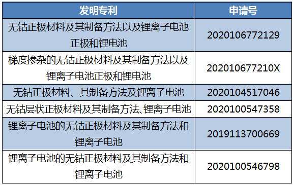 蜂巢能源部分有關(guān)無鈷正極材料的專利