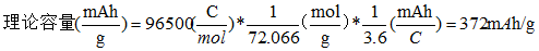 石墨負(fù)極中,鋰嵌入量最大時,形成鋰碳層間化合物,化學(xué)式LiC6,即6個碳原子結(jié)合一個Li。6個C摩爾質(zhì)量為72.066 g/mol,石墨的最大理論容量為: