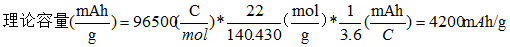 對于硅負(fù)極,由5Si+22Li++22e- ↔ Li22Si5 可知, 5個硅的摩爾質(zhì)量為140.430 g/mol,5個硅原子結(jié)合22個Li,則硅負(fù)極的理論容量為: