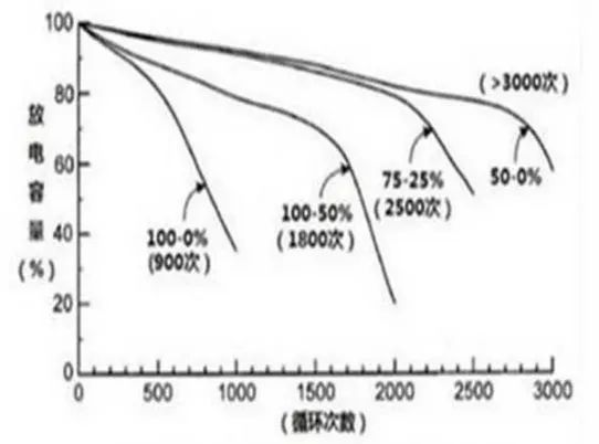 上圖為某三元鋰電池的充放電特性圖,可以看出,不同的充放電方式對電池的壽命影響不一樣,如上圖數(shù)據(jù),以25%-75%充放電的壽命可以達(dá)到2500次,即我們所說的電池淺充淺放。電池壽命這個話題我們以后還會深入討論。