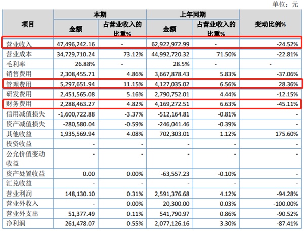 公司報(bào)告期內(nèi)管理費(fèi)用為5,297,651.94元,較上年同期4,127,035.02元上升28.36%,主要是因?yàn)?020年公司掛牌新三板,中介服務(wù)費(fèi)大幅度增加。期內(nèi)財(cái)務(wù)費(fèi)用2,288,463.27元,上年同期為4,169,272.51元,同比下滑45.11%。