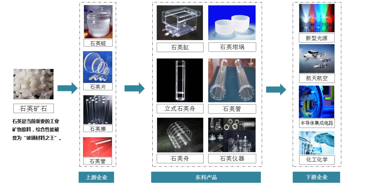 東科石英是一家專注于半導(dǎo)體以及光伏領(lǐng)域用石英產(chǎn)品的高新技術(shù)企業(yè),主營(yíng)業(yè)務(wù)為石英產(chǎn)品的研發(fā)、生產(chǎn)和銷售,另外,公司還從事電子元器件的封裝服務(wù)和銷售。公司產(chǎn)品主要包括各類石英器件和封裝電子元器件,石英玻璃制品因其高純度、耐高溫、低膨脹和極佳的光譜透過(guò)性等特殊的理化性能,可用于半導(dǎo)體工業(yè)方面的硅片承載器的制造,用于半導(dǎo)體工業(yè)中的擴(kuò)散、氧化和LPCVD工序,同時(shí)也可作為光伏電池片制作過(guò)程中不可或缺的腔體。