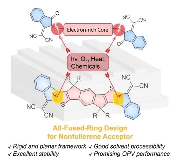 中國(guó)粉體網(wǎng)訊 有機(jī)光伏具有質(zhì)輕、柔性和可大面積加工等優(yōu)點(diǎn),受益于分子光伏受體材料的發(fā)展,其能量轉(zhuǎn)換效率已達(dá)到18%。為實(shí)現(xiàn)商業(yè)化應(yīng)用,材料和器件的長(zhǎng)期光熱穩(wěn)定性仍面臨挑戰(zhàn)。傳統(tǒng)D-A型電子受體材料普遍采用3-(二氰基亞甲基)靛酮(INCN)及其衍生物作為強(qiáng)拉電子末端,但I(xiàn)NCN類受體材料在光、水氧、熱和堿等作用下易發(fā)生降解,這成為制約器件穩(wěn)定性的關(guān)鍵因素。