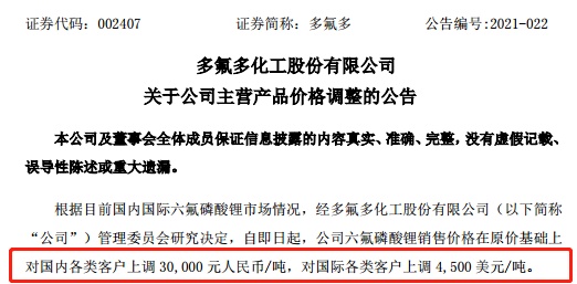 4月19日,六氟磷酸鋰龍頭企業(yè)多氟多(002407.SZ)發(fā)布公告稱,該公司六氟磷酸鋰銷售價格在原價基礎(chǔ)上對國內(nèi)各類客戶上調(diào) 30000 元人民幣/噸,對國際各類客戶上調(diào) 4500 美元/噸。