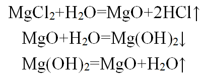 將鹵水濃縮到一定濃度后,直接噴入到熱分解反應爐中,在800℃~1000℃進行熱分解產出粗制MgO。粗制MgO經水洗除去可溶性氯化物,并使粗制MgO完全轉化為Mg(OH)2,再經1600℃~2000℃煅燒生成高純MgO。其工藝原理為: