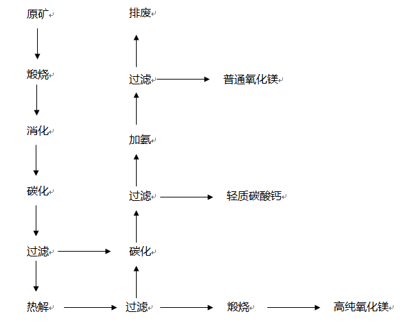 該法為菱鎂礦經煅燒生成輕燒氧化鎂,輕燒氧化鎂經消化、碳化制得碳酸氫鎂溶液,采用活性炭為吸附劑脫除碳酸氫鎂溶液中的鐵離子,經吸附除雜后的碳酸氫鎂溶液再熱解,熱解得到的堿式碳酸鎂過濾洗滌后干燥,再在煅燒得高純氧化鎂產品。