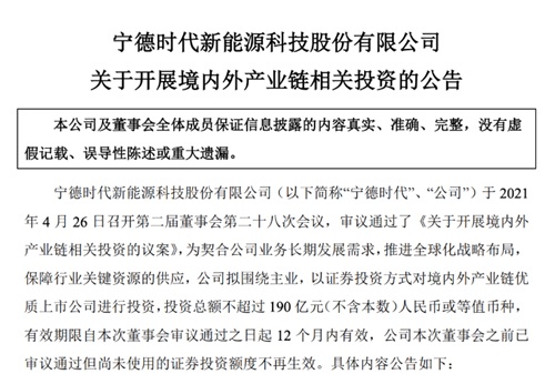 同日,寧德時代發(fā)布公告,公司擬圍繞主業(yè),以證券投資方式對境內(nèi)外產(chǎn)業(yè)鏈優(yōu)質(zhì)上市公司進行投資,投資總額不超過190億元(不含本數(shù))人民幣或等值幣種。