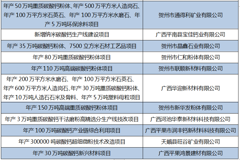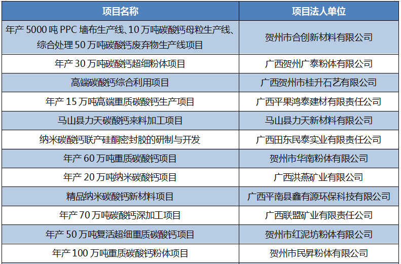 2021年1-4月廣西碳酸鈣重點備案項目匯總