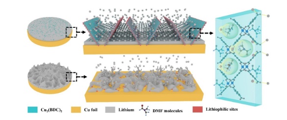 此外,該團隊采用液相沉積自組裝法,在銅集流體表面原位構筑具有立體親鋰位點開式構架的MOF膜(OA-MOF)作為鋰負極宿主材料,實現親鋰位體積的彈性膨脹和收縮,促進對動態(tài)化SEI層的加固效果,優(yōu)化鋰金屬沉積/剝離過程的動力學。相關成果以“Dynamical SEI Reiforced by Open-Archiecture MOF Film with Stereoscopic Lithiophilic Sites for High-Performance Lithium-Metal Batteries”為題發(fā)表在期刊Adv. Funct. Mater.上。