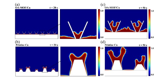 圖5:COMSOL模擬OA-MOF/Cu和原始Cu電極上不同時間段的鋰傳質生長