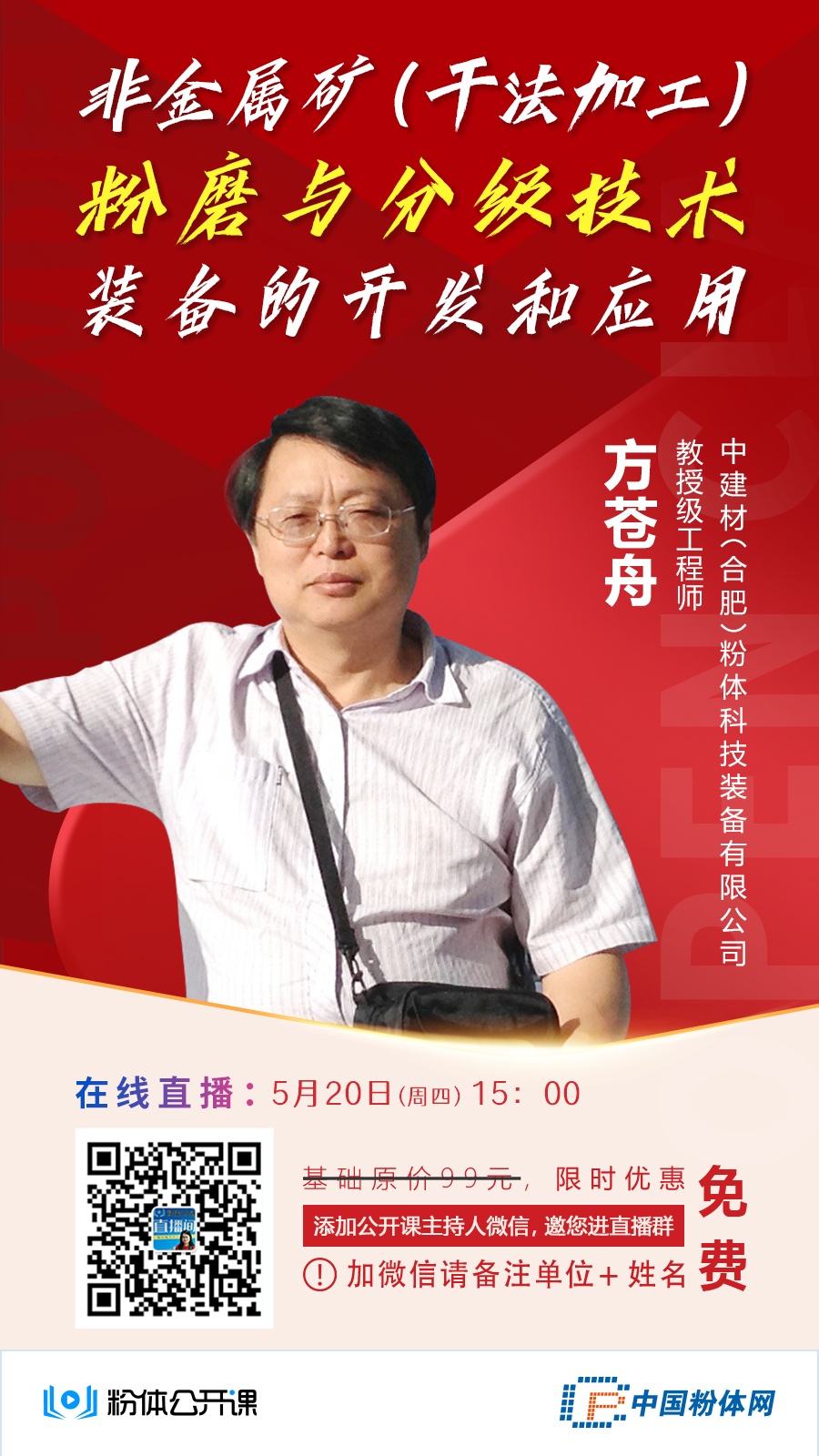 盡管我國非金屬礦工業(yè)已經(jīng)取得一定發(fā)展,但不得不承認(rèn),行業(yè)內(nèi)存在的“窮”、“小”、“散”、“粗”的局面沒有得到改變,出現(xiàn)企業(yè)生產(chǎn)粗放管理、加工和技術(shù)水平落后的情況。因此,產(chǎn)業(yè)結(jié)構(gòu)調(diào)整,轉(zhuǎn)型升級(jí)改造迫在眉睫,裝備水平的提升成為非金屬礦行業(yè)實(shí)現(xiàn)經(jīng)濟(jì)效益和長(zhǎng)遠(yuǎn)發(fā)展的重要前提和保證。為此,中國粉體網(wǎng)旗下平臺(tái)粉體公開課邀請(qǐng)到合肥水泥研究設(shè)計(jì)院、中建材(合肥)粉體科技裝備有限公司教授級(jí)工程師方蒼舟做客直播間作《非金屬礦(干法加工)粉磨與分級(jí)技術(shù)裝備的開發(fā)和應(yīng)用》的報(bào)告。他將從非金屬礦的物理性能、干法加工特點(diǎn)講述,著重講解非金屬礦干法加工的常用設(shè)備、主流設(shè)備的研發(fā)和應(yīng)用;從分級(jí)設(shè)備的特點(diǎn)、種類和適用范圍等內(nèi)容對(duì)非金屬礦用粉磨分級(jí)設(shè)備進(jìn)行專業(yè)講解并對(duì)存在問題進(jìn)行解答。2021年5月20日下午3:00,我們相約中國粉體網(wǎng)粉體公開課!