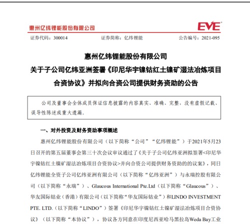 中國粉體網(wǎng)訊 5月24日,億緯鋰能(300014.SZ)發(fā)布公告稱,公司全資子公司億緯亞洲與永瑞、Glaucous、華友國際鈷業(yè)、LINDO簽署《印尼華宇鎳鈷紅土鎳礦濕法冶煉項目合資協(xié)議》。