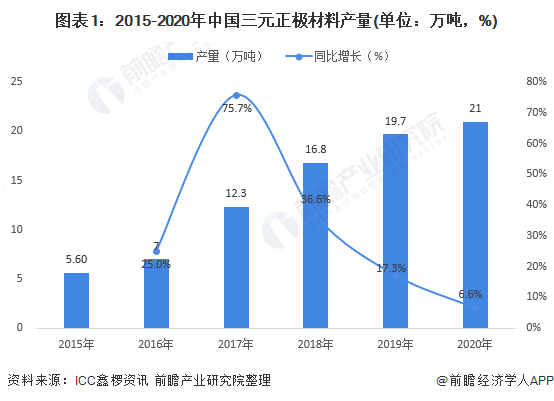 三元材料是鎳鈷錳酸鋰和鎳鈷鋁酸鋰為代表的多元金屬?gòu)?fù)合氧化物,是動(dòng)力電池主要正極材料之一,主要用于乘用車以及大部分物流車。近年來,國(guó)內(nèi)三元材料產(chǎn)量增長(zhǎng)勢(shì)頭略顯不佳。據(jù)鑫欏資訊統(tǒng)計(jì),2015-2020年,中國(guó)三元正極材料產(chǎn)量呈逐年上升趨勢(shì)。2020年國(guó)內(nèi)三元材料累計(jì)產(chǎn)量約為21萬(wàn)噸,同比增長(zhǎng)6.6%,增速下滑明顯。