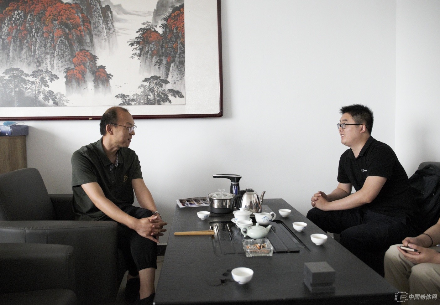 中國(guó)粉體網(wǎng)會(huì)展部總經(jīng)理孔德宇與博奧新材銷售總監(jiān)張春先先生交流