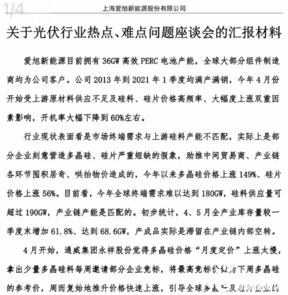 中國(guó)粉體網(wǎng)訊 對(duì)于近期的硅料價(jià)格高幅度拉升,行業(yè)企業(yè)接連漲價(jià)的背景之下,今日,愛(ài)旭股份發(fā)布一篇《關(guān)于光伏行業(yè)熱點(diǎn)、難點(diǎn)問(wèn)題座談會(huì)的匯報(bào)材料》的文章,引發(fā)行業(yè)關(guān)注與熱議。