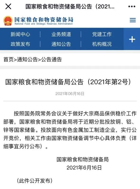 中國粉體網(wǎng)訊 據(jù)國家糧食和物資儲備局6月16日消息,按照國務(wù)院常務(wù)會議關(guān)于做好大宗商品保供穩(wěn)價工作部署,國家糧食和物資儲備局將于近期分批投放銅、鋁、鋅等國家儲備。投放面向有色金屬加工制造企業(yè),實行公開競價,相關(guān)工作由國家物資儲備調(diào)節(jié)中心具體負責。