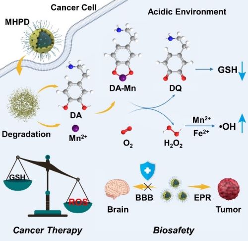 圖2. 負載多巴胺的錳摻雜的介孔氧化硅納米顆粒用于腫瘤催化治療的原理示意圖