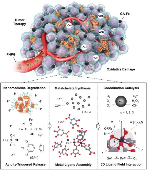 圖3. 負載沒食子酸鹽的鐵摻雜的介孔氧化硅納米顆粒用于腫瘤催化治療的原理示意圖