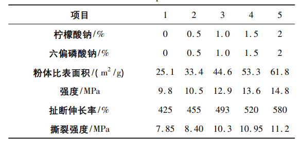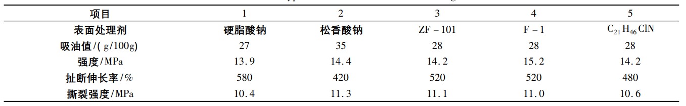 (3)采用不同的表面處理劑,性能不同,其中硬脂酸的伸長率較高;采用松香酸鈉處理的強度和撕裂強度較高,伸長率較低;而其中采用F-1鋁酸酯偶聯(lián)劑有較高的強度、伸長率及撕裂強度。