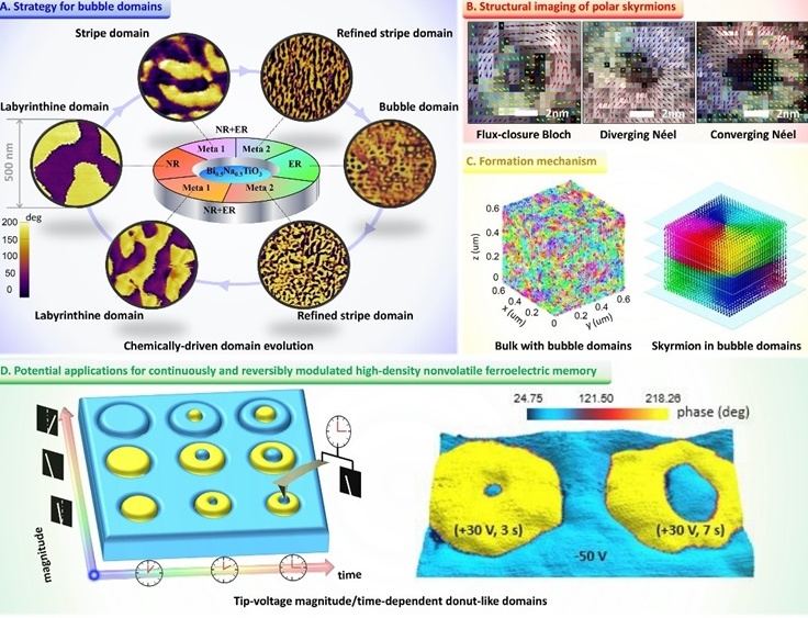 圖例:A.在鈦酸鉍鈉基弛豫鐵電陶瓷中通過化學改性來誘發(fā)泡狀疇的策略。B.用球差校正的STEM對潛在的極性斯格明子進行實空間成像。C.相場模擬的結果揭示塊體鐵電材料中的多種極性結構。D.泡狀疇在外加電場作用下演變?yōu)椤疤鹛鹑Α睜铍姰牻Y構,在高密度存儲方向可能具有潛在的應用價值。