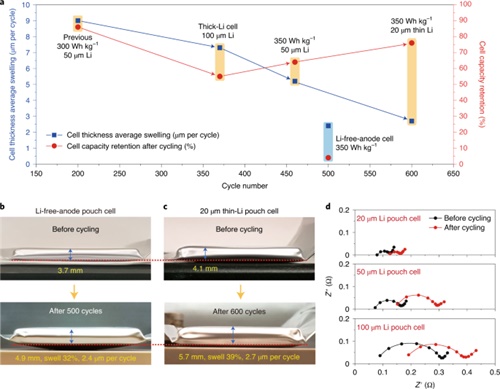 該團(tuán)隊(duì)將該設(shè)計(jì)的成功歸功于較薄的條帶促進(jìn)了更好的SEI,因此與扼殺重要電化學(xué)反應(yīng)的較厚條帶相比,電解質(zhì)和陽(yáng)極之間有更好的相互作用。在解決了與鋰金屬電池有關(guān)的一個(gè)關(guān)鍵問(wèn)題之后,作者希望通過(guò)一個(gè)被稱(chēng)為Battery500的多機(jī)構(gòu)聯(lián)盟繼續(xù)改進(jìn)該技術(shù),該聯(lián)盟正在努力實(shí)現(xiàn)500Wh/kg的能量密度。