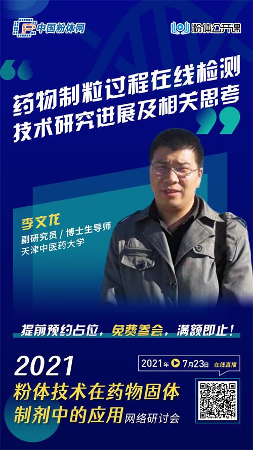 為解析制粒工藝生產(chǎn)過程中對顆粒得率、顆粒粒徑分布、顆粒含水率等質(zhì)量評價指標(biāo)的檢測,中國粉體網(wǎng)旗下粉體公開課平臺將于2021年7月23日舉辦“2021粉體技術(shù)在藥物固體制劑中的應(yīng)用網(wǎng)絡(luò)研討會”,屆時來自天津中醫(yī)藥大學(xué)的李文龍副研究員將作《藥物制粒過程在線檢測技術(shù)研究進(jìn)展及相關(guān)思考》報告,以具體的案例解析粒徑分布、水分含量以及過程的整體運(yùn)行狀態(tài)的在線監(jiān)測方法及其技術(shù)關(guān)鍵,并對常用過程分析技術(shù)的研究進(jìn)展進(jìn)行展望。在此基礎(chǔ)上給出報告人的相關(guān)思考,以期為相關(guān)領(lǐng)域的研究提供參考。