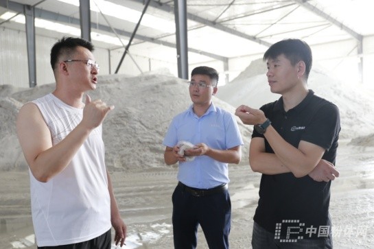 中天石英砂郝總與粉體網(wǎng)宋總、百特光電涂總在車間交流