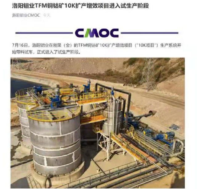 中國粉體網(wǎng)訊 洛陽鉬業(yè)7月16日發(fā)布消息,公司旗下剛果(金)TFM銅鈷礦10K擴產(chǎn)增效項目開始帶料試車,正式進入試生產(chǎn)階段。10K項目設計產(chǎn)能年處理礦石量330萬噸,年產(chǎn)陰極銅8.85萬噸,年產(chǎn)氫氧化鈷7280噸。10K項目是公司擴產(chǎn)增效重點項目,通過挖掘內(nèi)生性增長潛力,將資源優(yōu)勢轉化為產(chǎn)能優(yōu)勢,是提升盈利能力及核心競爭力的重大舉措。