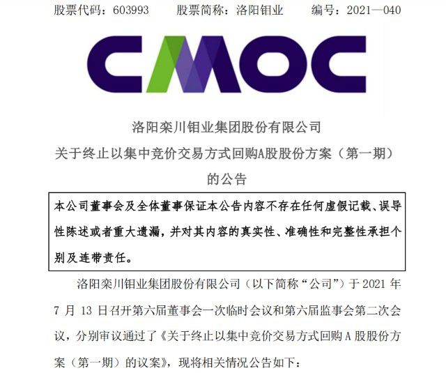 7月13日,洛陽鉬業(yè)發(fā)布公告,有關公司以集中競價交易方式回購公司A股股份事項,公司于2021年7月13日召開第六屆董事會第一次臨時會議和第六屆監(jiān)事會第二次會議,審議通過了《關于終止以集中競價交易方式回購A股股份方案(第一期)的議案》,據(jù)此,公司決議終止回購A股股份方案(第一期)。
