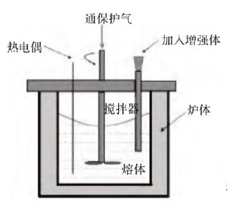 機械攪拌法是在攪拌的過程中將增強體顆粒加入到基體金屬液中,利用高速旋轉(zhuǎn)的攪拌裝置使增強體均勻混合入基體金屬液之中,然后澆入模具中得到想要的鑄件。其生產(chǎn)設(shè)備見圖2所示。機械攪拌法操作過程較為簡單,成本低廉,不到其他加工工藝的一半,是可以廣泛應(yīng)用的方法,目前工業(yè)上制備復(fù)合材料大多數(shù)都是采用該方法。