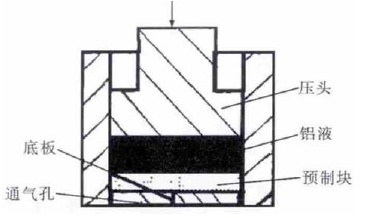 這種方法首先是要按照零件的形狀將增強體材料制備成預(yù)制塊,然后放入鑄型。在重力下澆注液態(tài)金屬或合金,隨后對金屬液施加壓力,使基體熔液滲入到預(yù)制塊中形成錠。其制備示意圖見圖3所示。