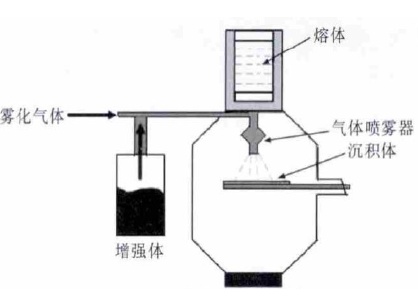 噴射沉積法是一種新型的加工工藝,主要是將熔化的基體金屬液在高速流動的惰性氣體中霧化向外噴出,同時將增強體顆粒添加到霧化噴出的金屬液體中,使兩者在沉降的過程中混合,最后共同在經(jīng)過預(yù)處理的基體上沉積制得想要的復(fù)合材料。制備過程見圖4所示。