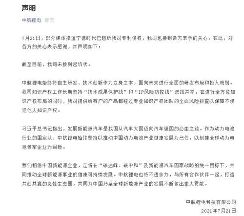 “寧德時(shí)代已就中航鋰電專(zhuān)利侵權(quán)案遞交起訴書(shū),案件已受理。涉案專(zhuān)利涉及發(fā)明與實(shí)用新型專(zhuān)利,此次涉嫌侵權(quán)電池已搭載在數(shù)萬(wàn)輛車(chē)上!睂幍聲r(shí)代公關(guān)人士稱(chēng),對(duì)于寧德時(shí)代而言,知識(shí)產(chǎn)權(quán)是企業(yè)提高核心競(jìng)爭(zhēng)力的戰(zhàn)略資源,也是企業(yè)面對(duì)激烈國(guó)際競(jìng)爭(zhēng)的重要支撐,“長(zhǎng)期以來(lái),寧德時(shí)代高度重視知識(shí)產(chǎn)權(quán)的保護(hù)工作,同時(shí)積極加強(qiáng)知識(shí)產(chǎn)權(quán)合作,推動(dòng)產(chǎn)業(yè)健康有序發(fā)展”。