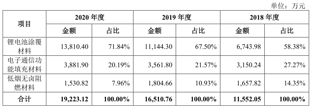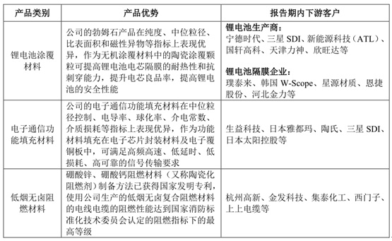 根據(jù)高工產(chǎn)業(yè)研究院統(tǒng)計(jì),2018及2019年,公司的鋰電池用勃姆石出貨量位列全國(guó)第一、全球第二。公司的電子通信功能填充材料已通過向生益科技提供產(chǎn)品進(jìn)入了華為 5G 產(chǎn)品供應(yīng)鏈。以公司低煙無鹵阻燃材料作為阻燃劑的電線電纜經(jīng)國(guó)家電線電纜質(zhì)量監(jiān)督中心檢測(cè),阻燃性能達(dá)到國(guó)家消防標(biāo)準(zhǔn)化技術(shù)委員會(huì)認(rèn)定的阻燃指標(biāo)下的最高等級(jí)。公司目前是寧德時(shí)代勃姆石產(chǎn)品的核心供應(yīng)商;電子通信功能填充材料已通過向生益科技提供產(chǎn)品進(jìn)入了華為 5G 產(chǎn)品供應(yīng)鏈;低煙無鹵阻燃材料已批量供應(yīng)西門子、杭州高新、金發(fā)科技等客戶。
