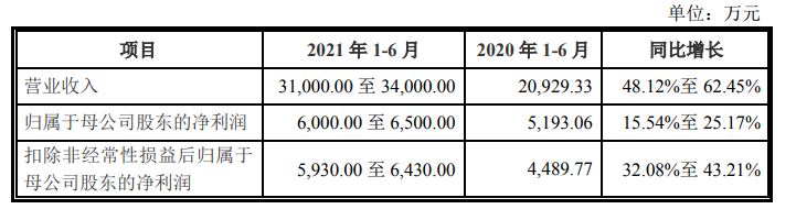 公司預(yù)計(jì)2021年1-6月可實(shí)現(xiàn)營(yíng)業(yè)收入約為31,000.00萬(wàn)元至34,000.00萬(wàn)元,同比增長(zhǎng)48.12%至62.45%,預(yù)計(jì)實(shí)現(xiàn)歸屬于母公司的凈利潤(rùn)約為6,000.00萬(wàn)元至6,500.00萬(wàn)元,同比增長(zhǎng)15.54%至25.17%;實(shí)現(xiàn)扣除非經(jīng)常性損益后歸屬于母公司股東的凈利潤(rùn)5,930.00萬(wàn)元至6,430.00萬(wàn)元,同比增長(zhǎng)32.08%至43.21%。 公司2021年1-6月?tīng)I(yíng)業(yè)收入及預(yù)計(jì)扣非后凈利潤(rùn)預(yù)計(jì)同比實(shí)現(xiàn)較好增長(zhǎng)的主要原因系:一方面,2020年上半年因新冠疫情影響,營(yíng)業(yè)收入較小,現(xiàn)國(guó)內(nèi)疫情已得到控制,經(jīng)營(yíng)恢復(fù)正常;另一方面,公司持續(xù)推進(jìn)既定發(fā)展戰(zhàn)略,產(chǎn)品在下游行業(yè)市場(chǎng)認(rèn)可度不斷提升,保持營(yíng)收穩(wěn)健增長(zhǎng)。