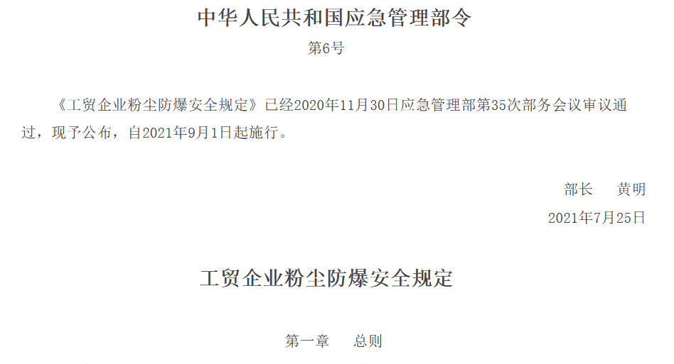 中國粉體網(wǎng)訊 近日,應急管理部發(fā)布公告稱,《工貿企業(yè)粉塵防爆安全規(guī)定》已經(jīng)2020年11月30日應急管理部第35次部務會議審議通過并予公布,自2021年9月1日起施行。