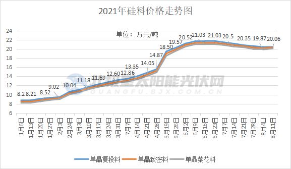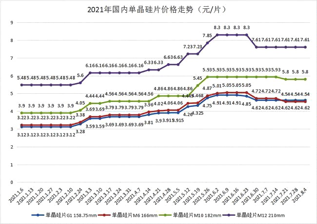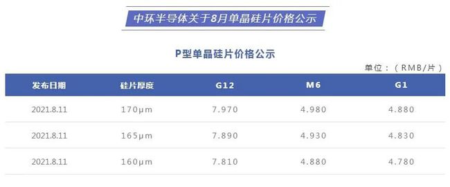 硅片方面,8月11日,中環(huán)股份公布8月單晶硅片定價,與7月17日公布的報價相比,M6每片上漲0.44元;相較于6月報價,G12每片上漲0.44元,G1每片上漲0.26元。