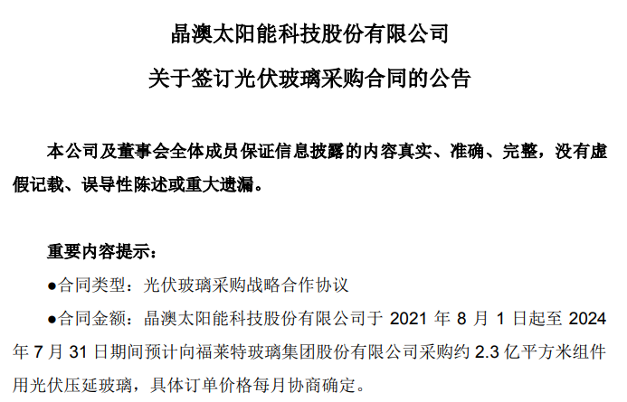 以光伏玻璃企業(yè)為例。近期,晶澳太陽能科技股份有限公司與福萊特玻璃集團股份有限公司簽署光伏玻璃采購《戰(zhàn)略合作協(xié)議》。協(xié)議約定,公司及公司指定的控股公司于2021年8月1日起至2024年7月31日期間預(yù)計向福萊特及其指定的全資控股公司采購約2.3億平方米組件用光伏壓延玻璃,具體訂單價格每月協(xié)商確定。