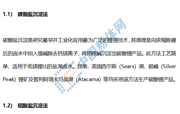 沉淀法通常將鹵水經(jīng)過自然蒸發(fā)濃縮至鋰含量到一定濃度,然后經(jīng)酸化或萃取除硼、除鈣鎂離子,最后加入純堿使鋰以Li2CO3的形式沉淀出來,主要以碳酸鹽沉淀法、鋁酸鹽沉淀法和硼鎂共沉淀法為主。